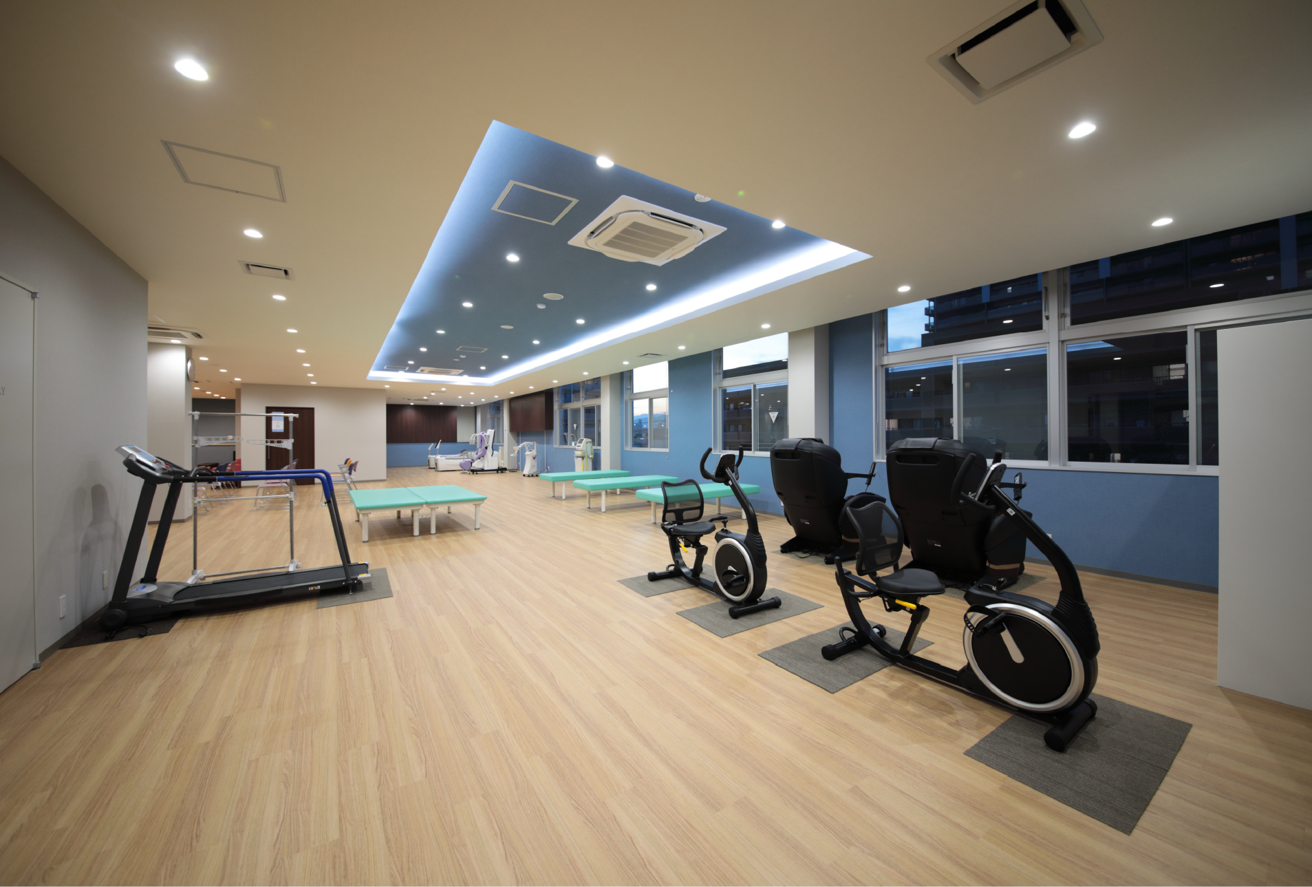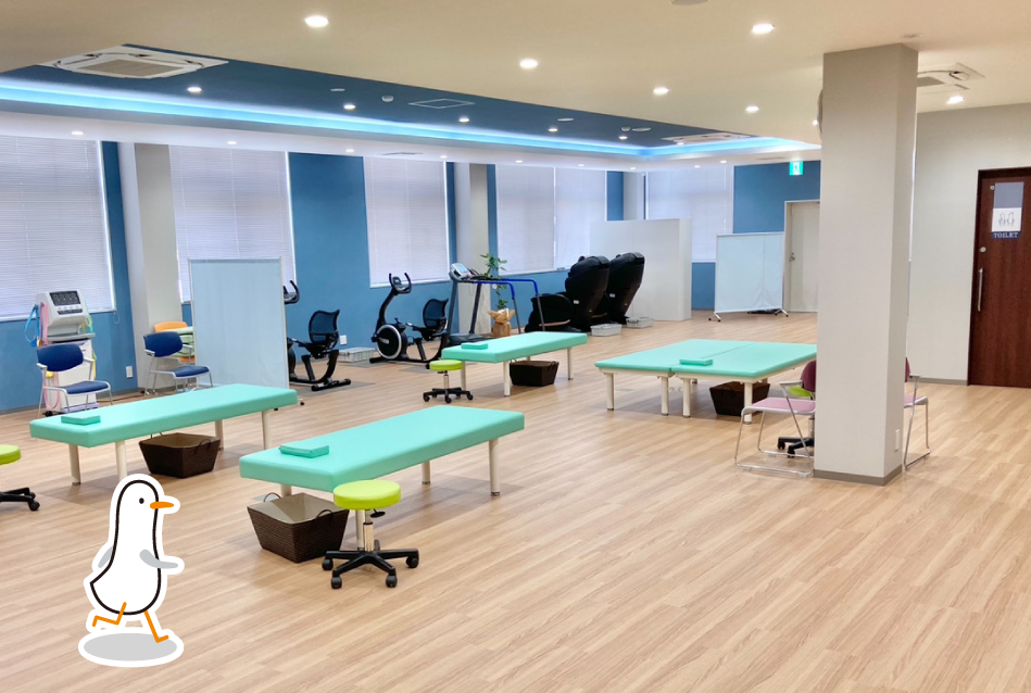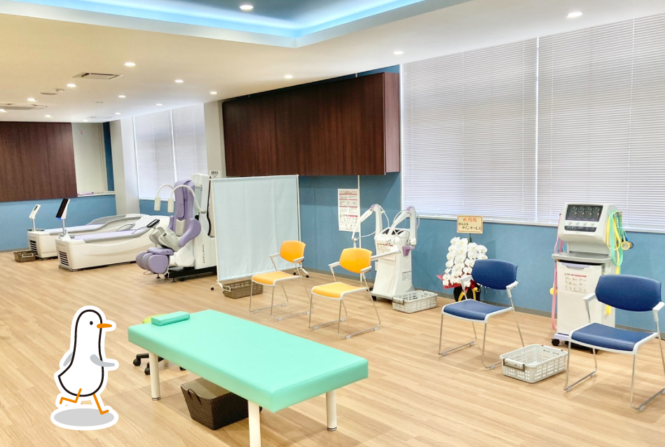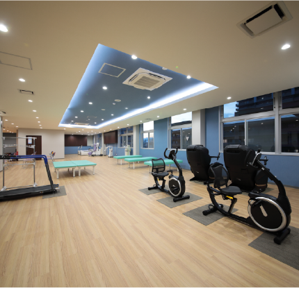 リハビリテーション室は広さが200m²あり、ウォーターベッド、腰椎けん引機器、低周波治療器、マイクロ波治療器、マッサージチェア(フジ医療器製)、トレーニングバイク、トレッドミルなどの機器を多数配置しております。